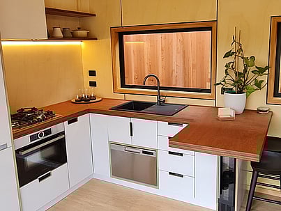 Our second design, Rua, is completely different, using all new (still sustainable) materials. Rua is 9.4 long, and 3m wide, with the main bedroom.... downstairs! Fitted out with all the Bosch mod cons, including a wine fridge, spectacular feature window and ample storage (seriously, unbelievable storage!). Rua is a great example of how tiny homes don't mean compromising on space or quality.